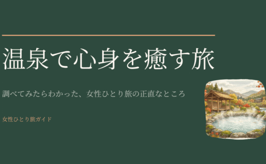 旅行 「温泉ひとり旅、してみたいけど不安」という30代・40代の女性へ。安全な宿の選び方、女性ひとり旅に向いているおすすめ温泉地まで、データをもとに調査。はじめての一人旅も、この記事を読めば動き出せます。 2026.03.29 旅行